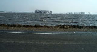 This is one of Minnesota's new lakes. It used to be a soybean field. The rain started to fall last night. There hasn't been a lot of rain yet, but any rain is bad news. The snowmelt has nowhere to go and the rain will just add to the standing water. Rivers are rising faster now, and local town leaders are pleading with residents to stop using any water appliances. I stopped at a hardware store this morning to get a coupler for our back-up sump pump. A woman there was angry because the sewer drain plugs were sold out. She couldn't find one anywhere. A man suggested that she use a soccer ball or a basketball. The woman stormed out. At the grocery store, people were stocking up on bottled water and soda.
